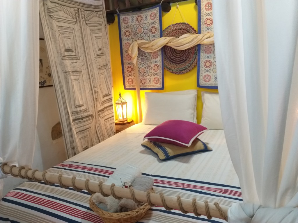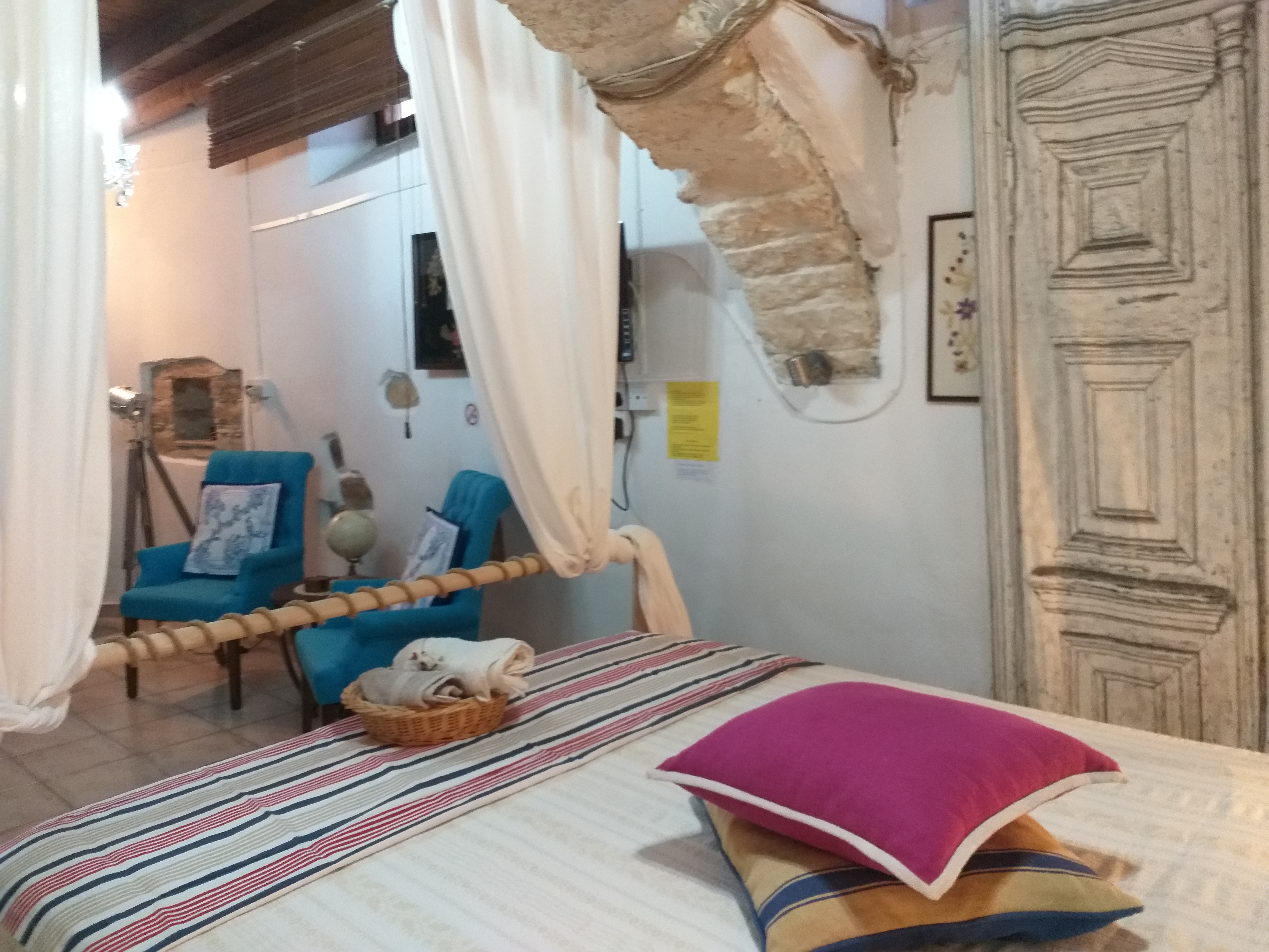 Our Junior “Petrino suite”is around 30 sq.meters and features a 300 year old stone-arch located inside the bedroom area. Its design is inspired from the Nautical world of Cycladic islands and Costa Amalfitana unique style. The suite offers a kitchen, a king size bed with anatomic comfortable matress, a sat Tv, free wi-fi, airconditioner, Nespresso coffee maker, tea and coffee facilities, a bathroom with korres toiletries.
